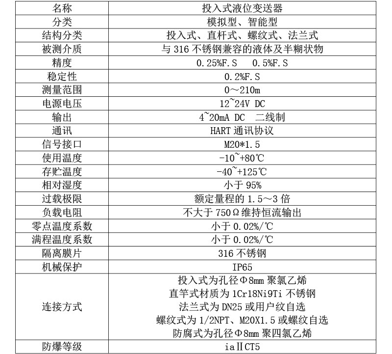 TH-UHT投入式液位计是基于所测液体静压与该液体高度成正比的原理,采用扩散硅或陶瓷敏感元件的压阻效应,将静压转成电信号。经过温度补偿和线性校正,转换成4-20mADC标准电流信号输出。投入式静压液位变送器的传感器部分可直接投入到液体中,变送器部分可用法兰或支架固定,安装使用极为方便。